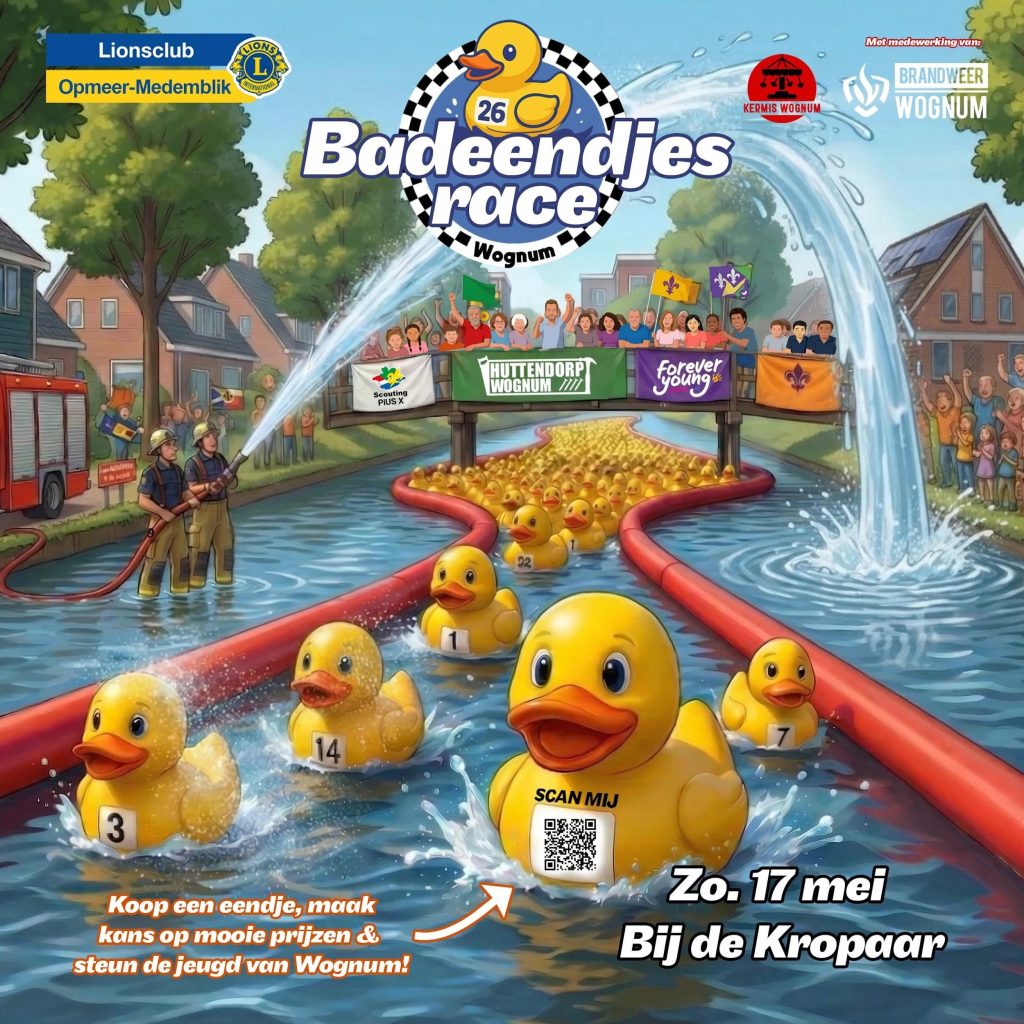 Na het succes van de eerste editie van de badeendjesrace, gaan de jeugdverenigingen van Wognum opnieuw in zee of beter gezegd, in de sloot met Lionsclub Opmeer-Medemblik. En dit jaar belooft het nóg beter en leuker te worden.